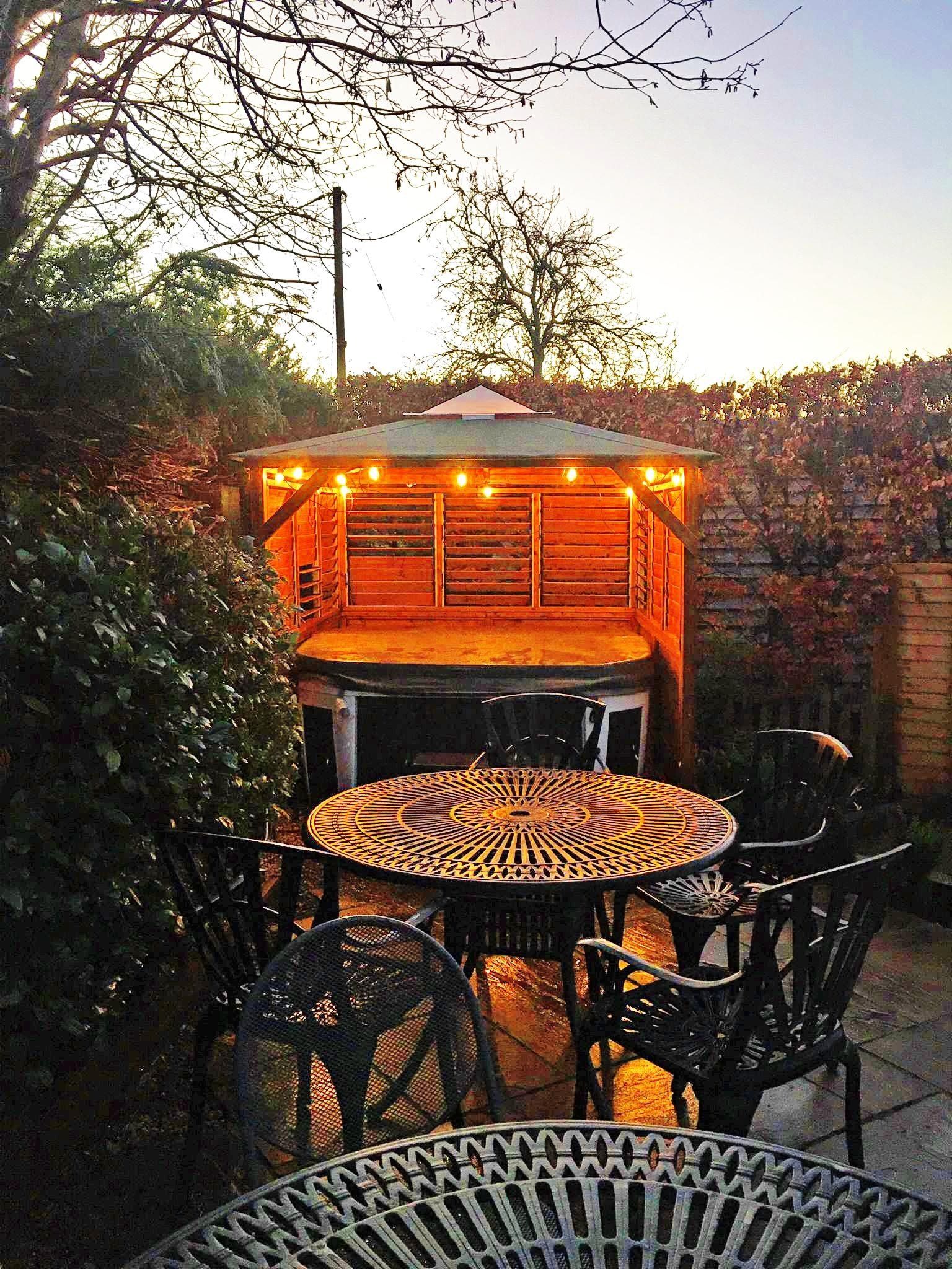 A permanent 4 - 6 person hot tub in the garden in it's own gazebo and can be hired at £325 for a weekend or £400 for a week.